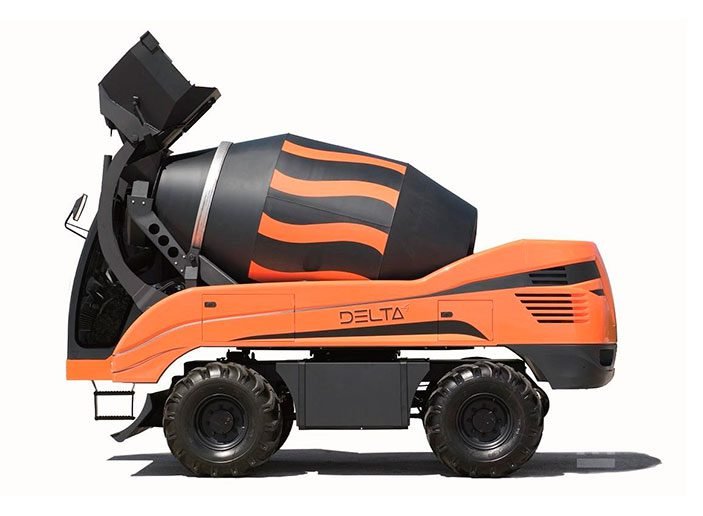 Concrete net output 2.6m³ (3.40 cubic yards). Rear loading with trilateral unloading (180° slewing). Four-wheel steering/drive.