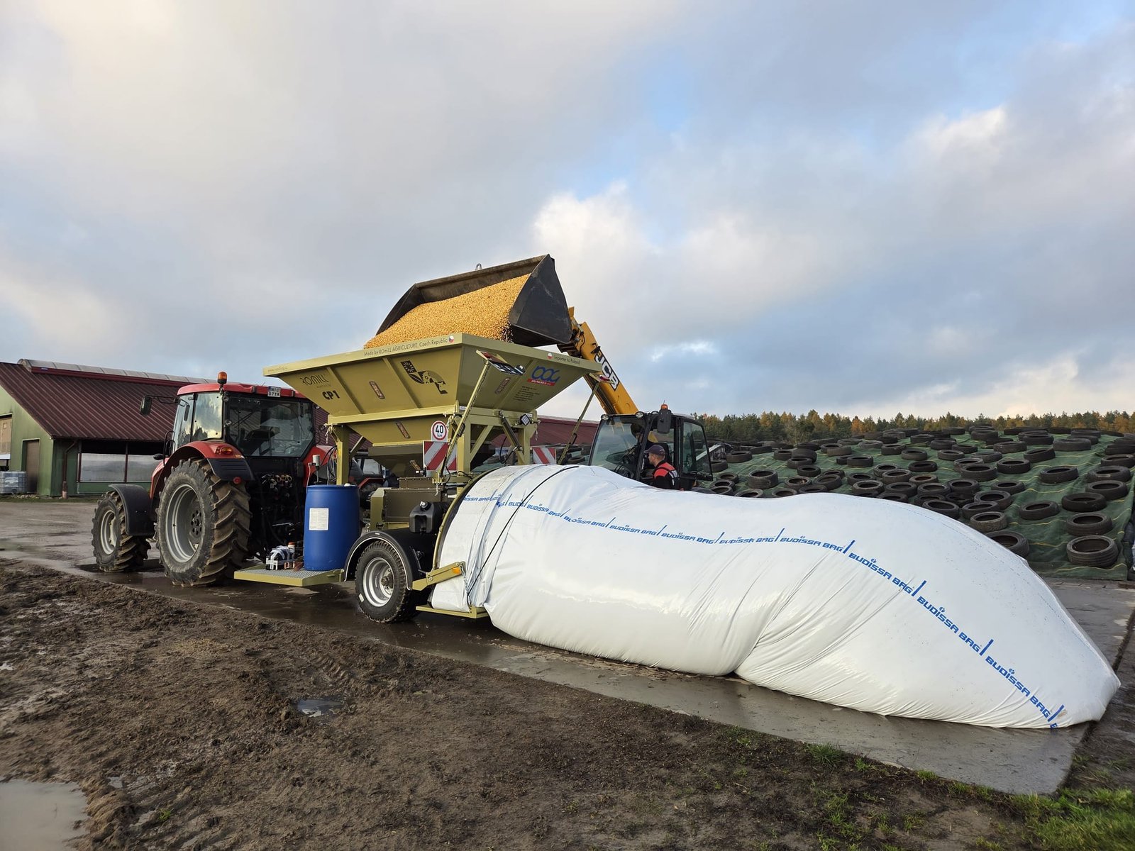 Professional silage bag filling machine with 5.5m³ bunker capacity. Performance of 250-300 tonnes per hour for efficient grain storage.
