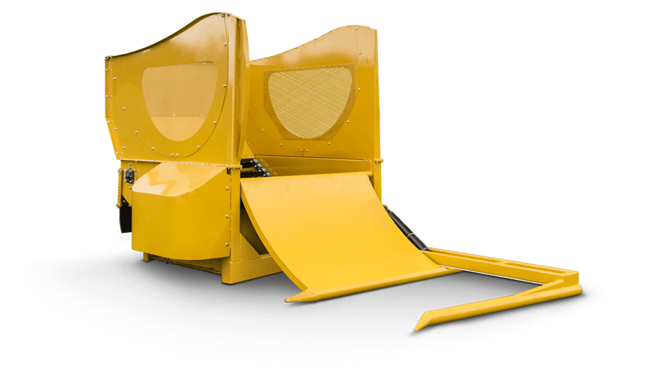 Square bale processor mounting on skidsteers, tractor loaders, or telehandlers. Scoop N’ Go design for quick loading with variable position deflector for bedding, feeding, or windrowing.