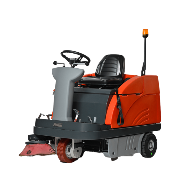 Compact ride-on vacuum sweeper with automated filter cleaning and 90-degree steering for excellent manoeuvrability. Up to 7,200 m²/h.