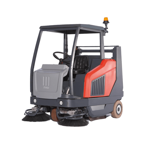 Compact ride-on sweeper in battery or petrol versions. Ideal for warehouses, hospitals, and schools with 35L hopper capacity.
