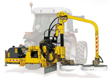 Revolutionary mower for grass along roadsides with guardrails, signs, or obstacles. Two cutting discs on independent arms with 180° tilt capability.