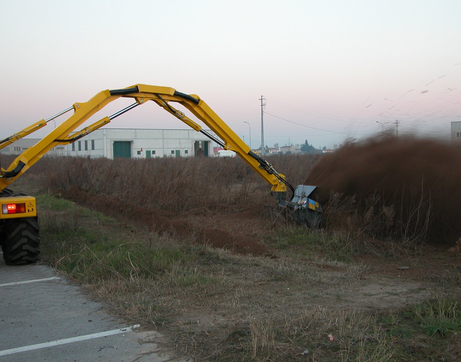 Revolutionary mower for grass along roadsides with guardrails, signs, or obstacles. Two cutting discs on independent arms with 180° tilt capability.